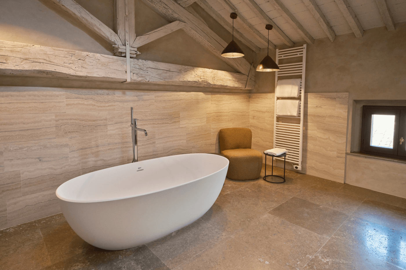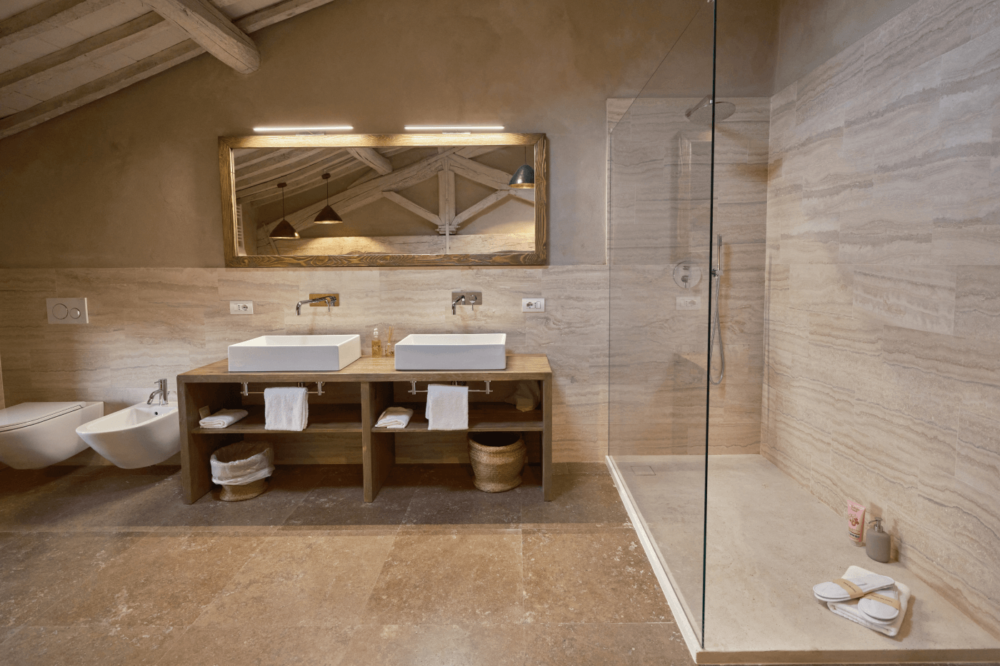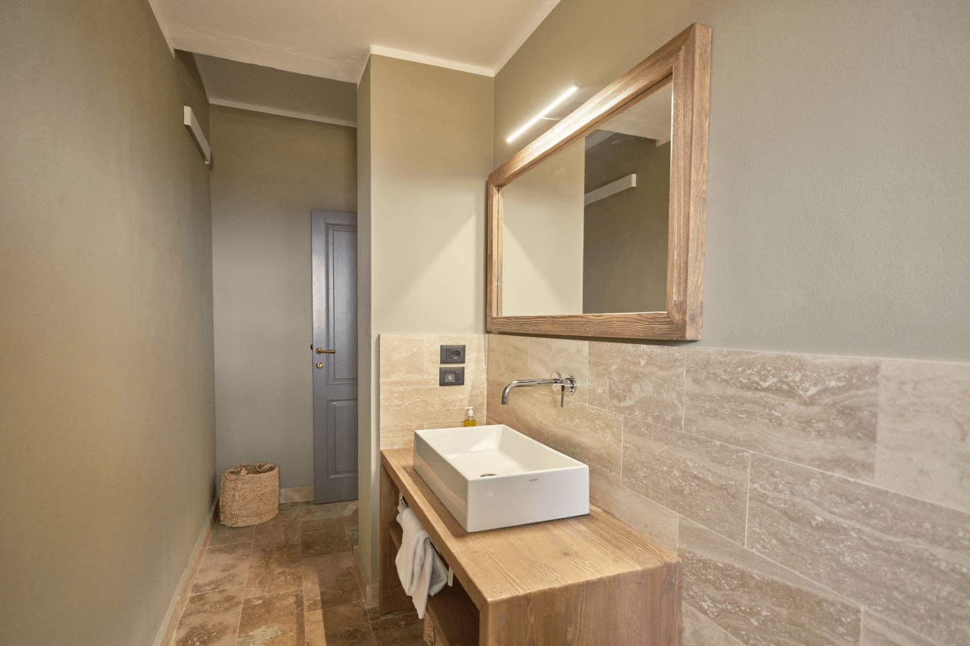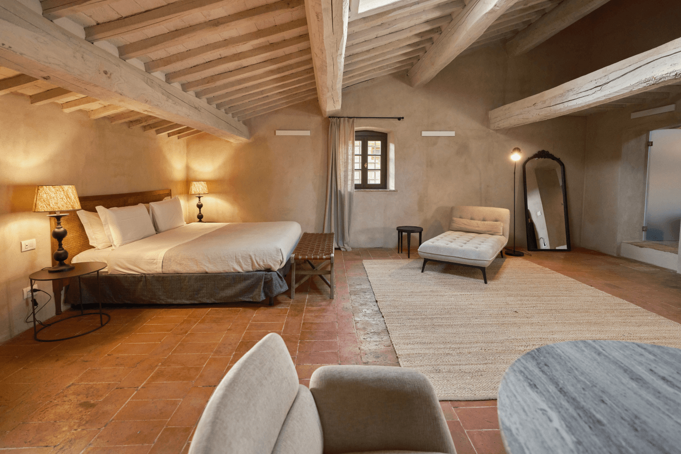 Ogni stanza è progettata per accogliere l’anima del Palazzo e del suo territorio. Ristrutturate con cura, utilizzando materiali nobili della tradizione locale, riflettono un’estetica raffinata e naturale. Travertino, legni pregiati e tessuti morbidi e naturali si combinano per creare un’atmosfera di calore e bellezza senza tempo. Ogni dettaglio, dagli arredi realizzati artigianalmente al gioco di luci che filtra dalle antiche finestre, invita a rallentare, respirare e lasciarsi avvolgere dalla magia della Toscana.